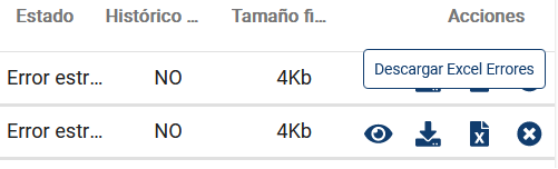 Se ha agregado un nuevo icono “Descargar Excel errores” en la columna “Acciones” que permitirá descargar el detalle del error de esquema del fichero.