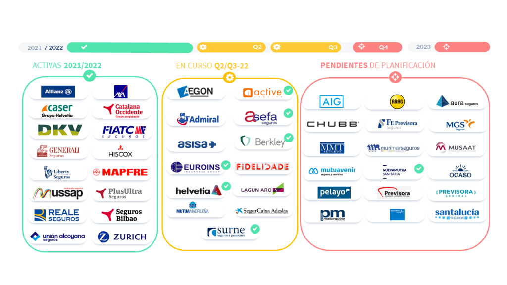 Las aseguradoras ACTIVE SEGUROS, ASEFA, BERKLEY, EUROINS INSURANCE, HELVETIA, SURNE y NUEVA MUTUA SANITARIA se encuentran también adheridas y en proceso de integración.